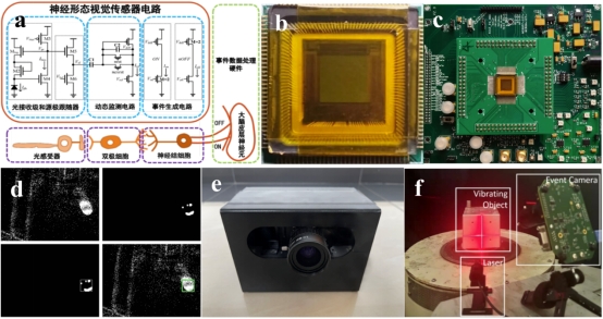 Neuromorphic vision differs from traditional global exposure imaging methods in that it encodes relative changes in light intensity into sparse, asynchronous events and has the significant advantages of high speed, high dynamics and low power consumption. It is especially suitable for application scenarios with strict time resolution requirements such as navigation and high-speed imaging. Based on the research and development of neuromorphic vision sensor chips (a-b), the research team developed AER data processing hardware and neuromorphic vision sensors (c). At the same time, based on this hardware, a neuromorphic-based visual navigation system (d-e) was designed and developed, which can be used for tasks such as target detection and pose estimation. A vibration frequency visual measurement system (f) was designed and developed, which can measure the vibration frequency of 10 μm amplitude under extreme lighting conditions.