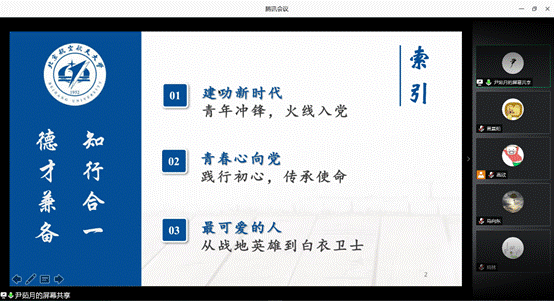 为深入贯彻落实中央、工信部、北京市和学校关于疫情防控的各项工作部署,有序开展疫情防控工作,发挥特殊时期公司党支部战斗堡垒作用,北航航空学院硕士生19052员工党支部和122cc太阳成集团测控系博士生第一党支部于202063日下午1630分联合邀请了北航研究生宣讲团讲师尹茹月同志带来题为“新时代‘最可爱的人’——疫情中青年党员践行初心使命”的宣讲会。本次宣讲会以腾讯会议的形式开展,共计48人参加。
