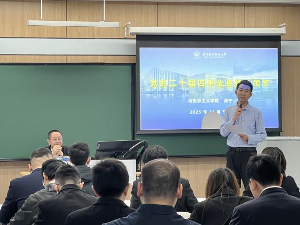 开班式结束后,高宁教授作题为《党的二十届四中全会精神领学》的首场党课。党的二十届四中全会高度评价了“十四五”时期我国经济社会发展取得的重大成就,审议通过了《中共中央关于制定国民经济和社会发展第十五个五年规划的建议》,为未来五年中国发展擎画蓝图。高宁教授以习近平总书记关于“十五五”规划建议的说明为引,分别从起草过程、基本内容、重点问题三个方面系统阐述“十五五”时期的经济社会发展的指导思想、重大原则、主要目标和重点任务。他强调,员工党支部书记应深刻学习领会党的二十届四中全会精神,引领党员和同学们将个人学业与服务国家重大战略需求和经济社会发展有机结合,潜心钻研、锤炼本领,把论文写在祖国大地上,奋力书写挺膺担当的青春篇章。