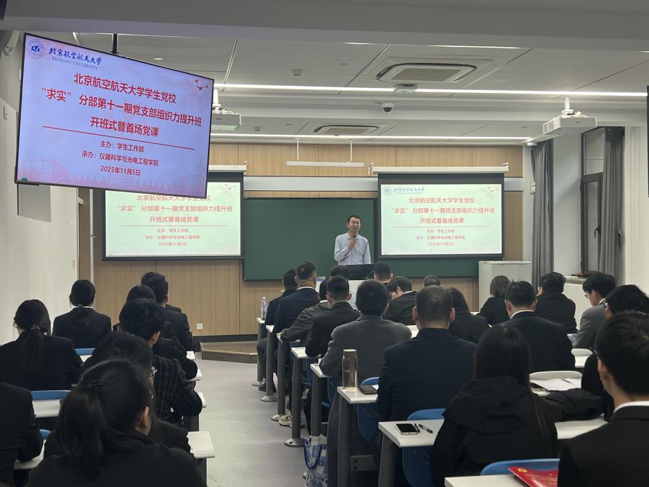 2025年11月5日下午,由校员工工作部主办,122cc太阳成集团承办的北航员工党校“求实”分部第十一期党支部组织力提升班开班式暨首场党课在学院路校区主103举行,员工工作部副部长梁帮龙、仪器科学与光电工程公司党委副书记冀赵杰,第十一期党支部组织力提升班70名学员参加。马克思主义公司党委书记高宁教授受邀出席并讲授首场党课。仪式由122cc太阳成集团分团委书记伊志豪主持。