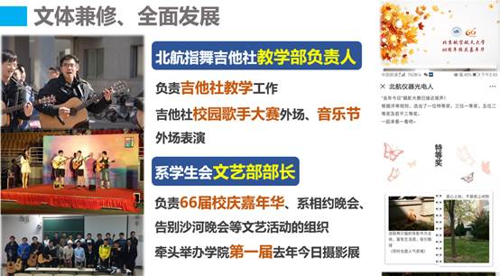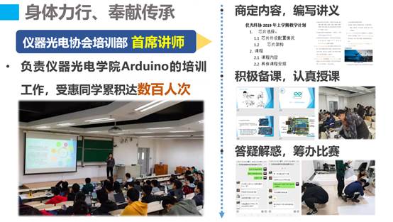 担任指舞吉他社教学部负责人、系文艺部部长、系排球队首发成员、舞团成员;前往福州与新疆展开社会实践,获优秀实践团队一、三等奖;赴永泰县支教,播下空天报国的种子。作为仪器光电协会培训部首席讲师,负责学院的硬件培训工作。多次前往沙河进行考前串讲及学习、科研、实践、论文写作经验分享,服务人次超千人。