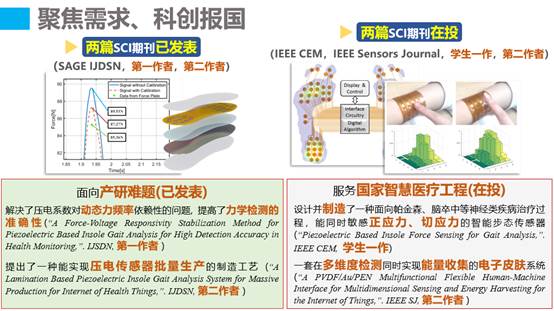 服务国家智慧医疗工程,在医疗电子领域已有2篇SCI论文(一作、二作)发表,另有2篇SCI论文(员工一作、二作)在投,并在IEEE-NSENS 2019国际会议上做英文报告,获与会专家一致好评。曾获全国老员工光电设计全国决赛二等奖(排名一)等9项科技竞赛奖项。以上科研成果已与361°、上海韦尔半导体展开合作讨论,即将前往国家康复辅具研究中心进行临床实验。