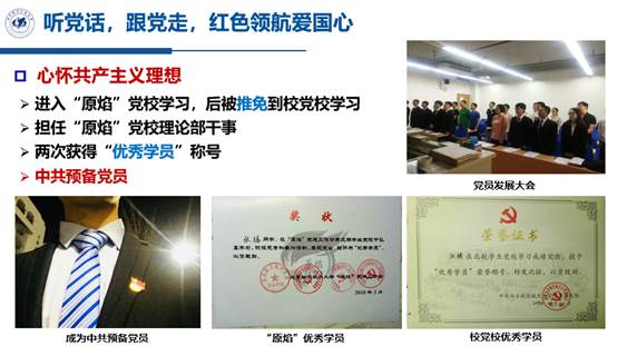 中共党员。一心向党,积极组织北航员工党支部组织力大赛、学院暑假党员集中学习等活动;思想引领,参演学院话剧《永恒》、校毕晚影舞《相约北航》;榜样先行,担任仪器光电协会副部长,主推朋辈辅导,实现学院冯如杯成绩大幅提升;关心班团建设,带领小班多次获得“优良学风班”、“标兵团支部”等荣誉。