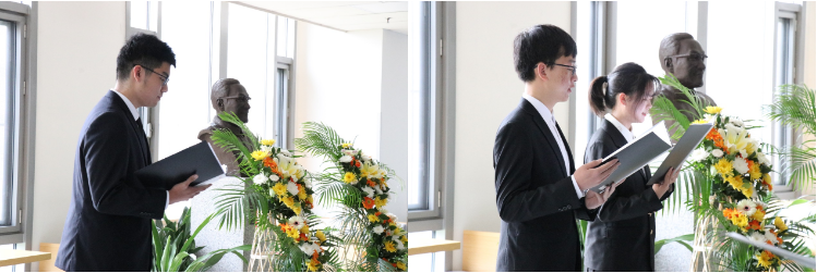 在接下来的环节中,士谔书院优秀学子代表张明远同学带领大家温情的回顾了林士谔先生光荣的一生。仪器学院优秀学子梁腾宇和士谔书院优秀学子丁小轩同学共同在林先生雕像前,深情的做《永恒》自创诗朗诵。