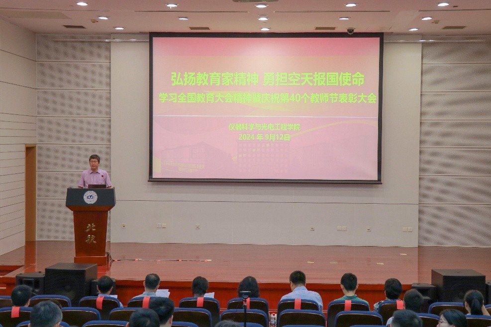 获奖教师代表屈玉福发表了真挚的感言。他以“热爱”“责任”“感恩”三个关键词,分享了自己20年教书育人的心得体会。屈老师表示,对教育事业的热爱是他不断前行的动力,强烈的责任感促使他用心对待每一位员工,而感恩之心则让他更加珍惜这份神圣的职业。员工代表郑奕表达了对老师们的深深敬意和感激之情。在仪器学院就读8年来,学院老师们以“高度”引领员工,以“深度”教导员工,以“温度”感动员工,共同助力员工阔步前行。