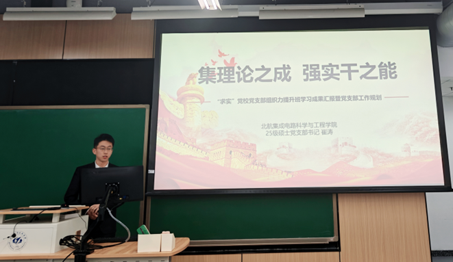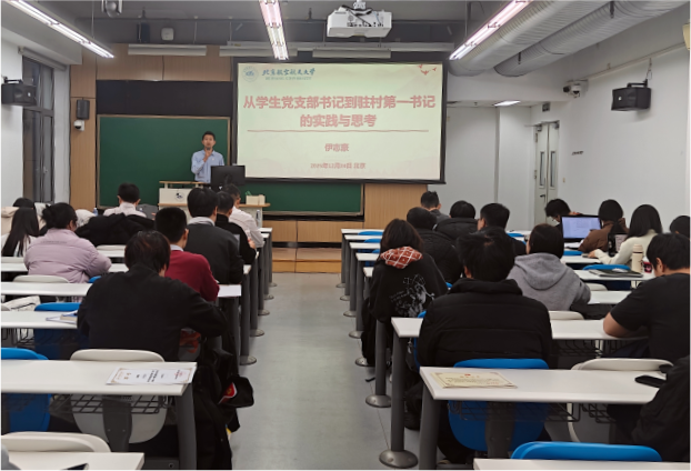 仪式首先由伊志豪老师讲授题为《从员工党支部书记到驻村第一书记的实践与思考》的主题党课。他结合员工党支部建设与阳坡村乡村振兴实践案例,系统阐述了基层党支部组织力的核心内涵与实践路径。通过介绍研究生“月宫一号”员工党支部推行“三化一体”工作法、实现组织生活与科研攻关深度融合的经验,以及北航派驻干部在阳坡村推动基础设施建设、培育特色产业、开展校地联动帮扶的实践,伊志豪生动诠释了党支部在基层工作中的战斗堡垒作用。党课还介绍了“五个四”工作法等实用党建方法,强调将科研报国信念融入支部工作,为学员提供了具有借鉴意义的实践指导。