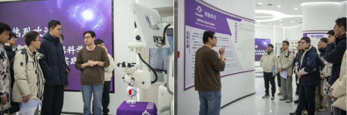 1月15日,实践队首先抵达图湃医疗,在企业相关负责人的热情接待下,开启了针对国产眼科医疗设备创新成果的专项探索。作为国内眼科医疗设备领域的领军企业,图湃医疗的核心产品研发与转化,与队员们在课堂上学习到的光学成像、精密仪器设计等核心知识高度契合。在负责人引导下,队员们先后走访研发中心、生产车间及成果展示区,重点关注设备的光学成像模块、精密控制单元等与专业相关的技术细节,深刻感受专业知识在临床医疗设备中的实际应用价值。