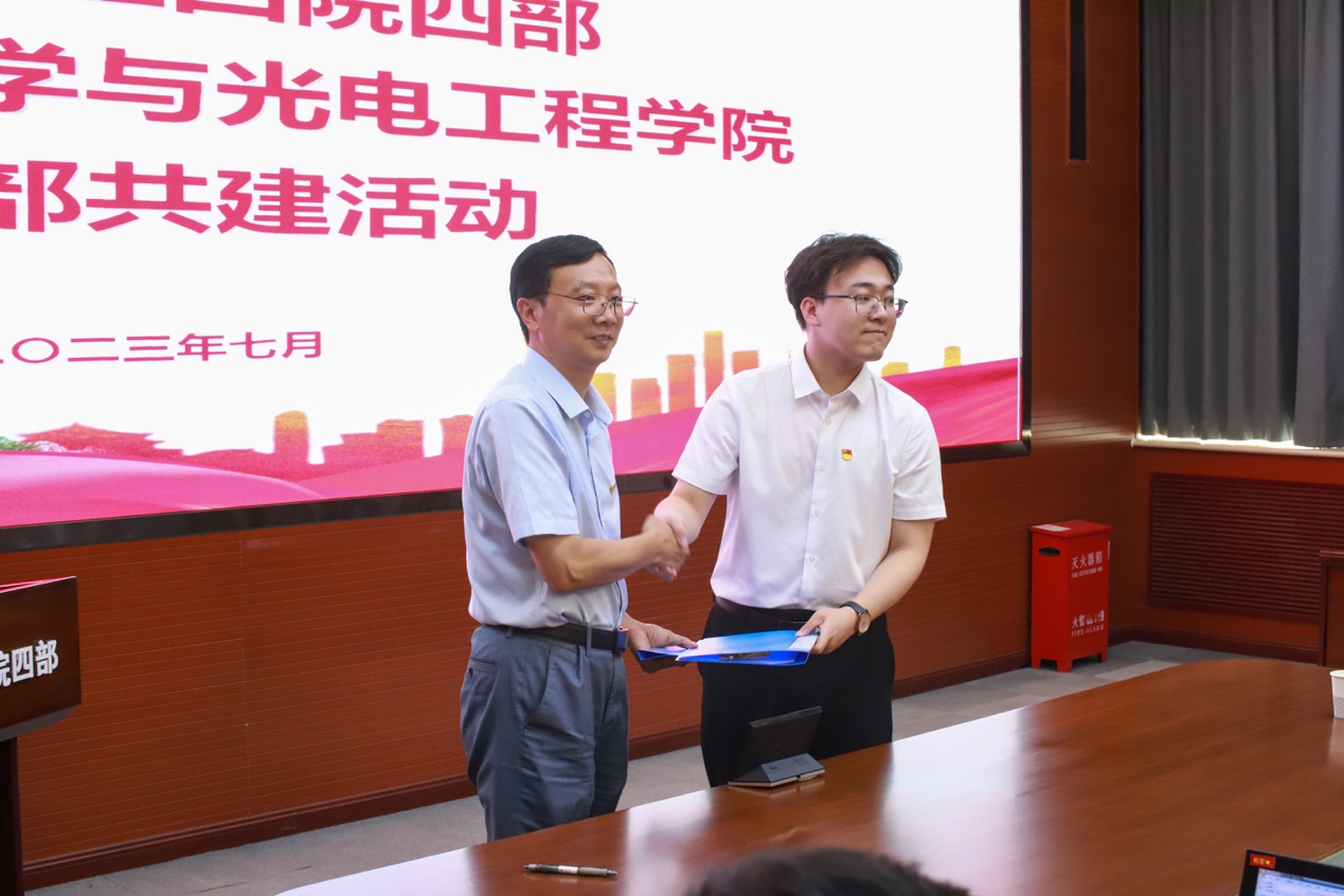 四院四部十室审计处联合党支部书记熊灵芳介绍党支部工作开展情况,致力于将党建工作和航天事业相结合,系统阐释了“陪飞,伴飞,远飞”的培养模式。122cc太阳成集团2022级测控党支部书记张起源介绍党支部在思想建设、组织建设、作风建设、制度建设等方面经验做法,秉持“永恒的陀螺精神”开展了系列理论学习、实践调研特色活动。双方签署了合作共建协议。