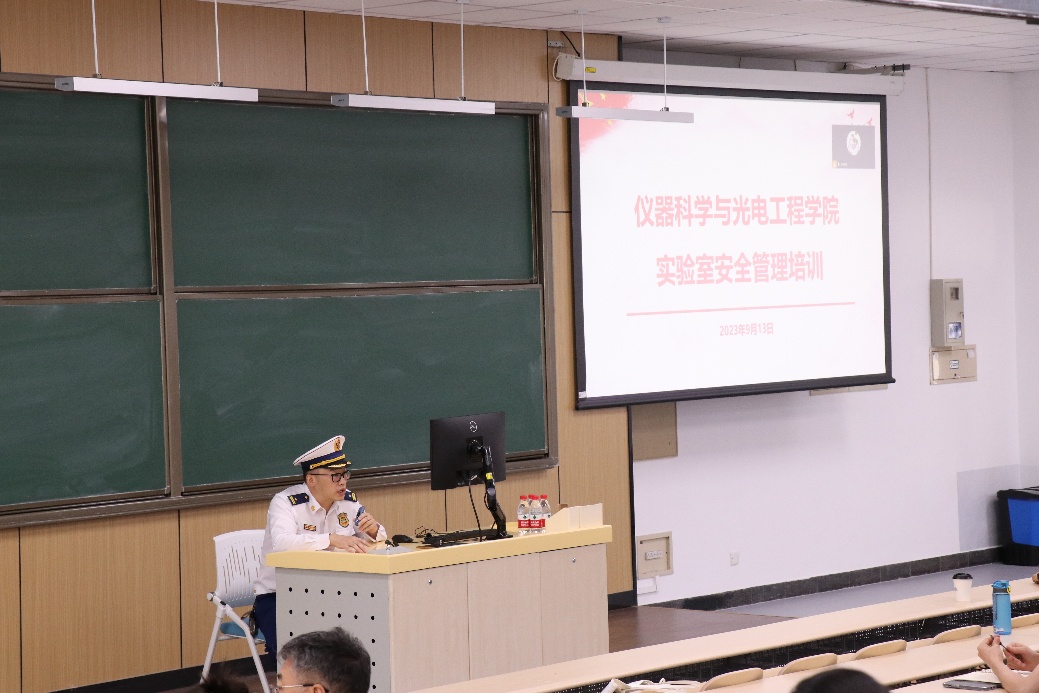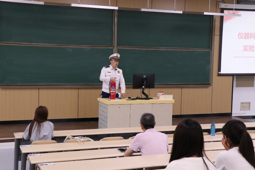 随后,学校保卫处消防科科长王庆华老师发言。他首先高度肯定了仪器光电学院对安全工作的重视程度,重点强调了禁止电动自行车和电池进楼入户,同时提醒师生们实验用到的锂电池在充电过程中也要做到远离可燃物且不离人。