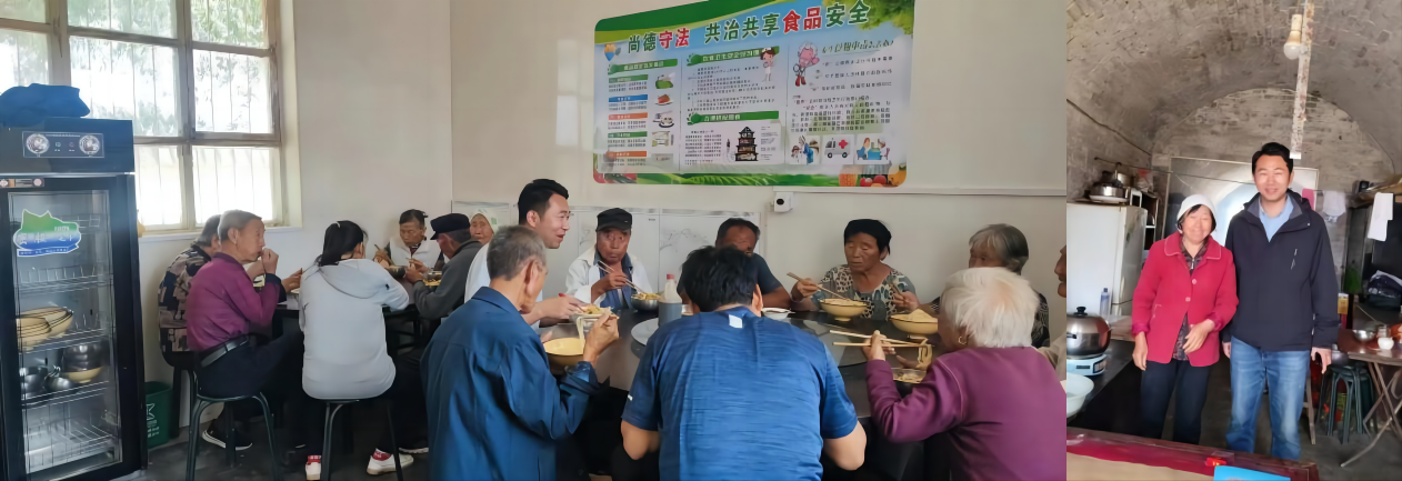 伊志豪在村里爱心食堂与老人共餐、入户走访村民