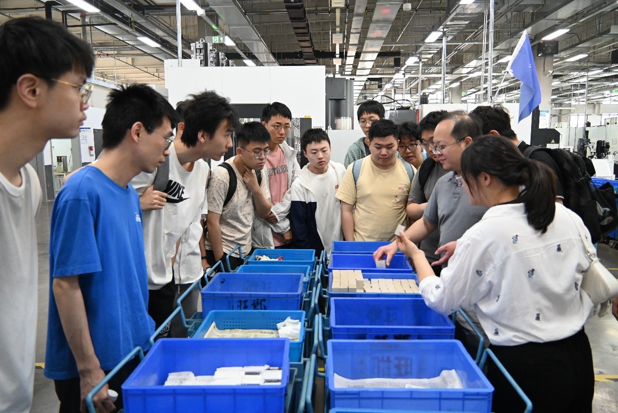 当日下午两点,仪光企校师生到达康斯特公司的智能仪表产业园,在4位企业导师的带领下分组进行参观。同学们首先进入零件生产车间,见识到了自动化生产线在生产效率、生产质量方面的巨大优势,并近距离接触了处于不同加工阶段的零件。
