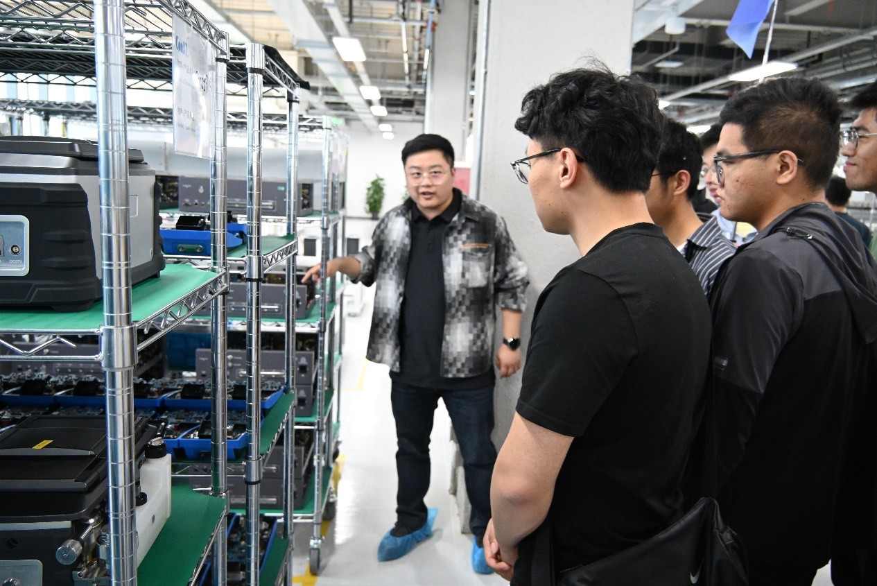 随后,同学们进入产品装配车间,企业导师深入浅出地讲解了生产线的设计用意——一个员工即可完成从装配到测试的工作。