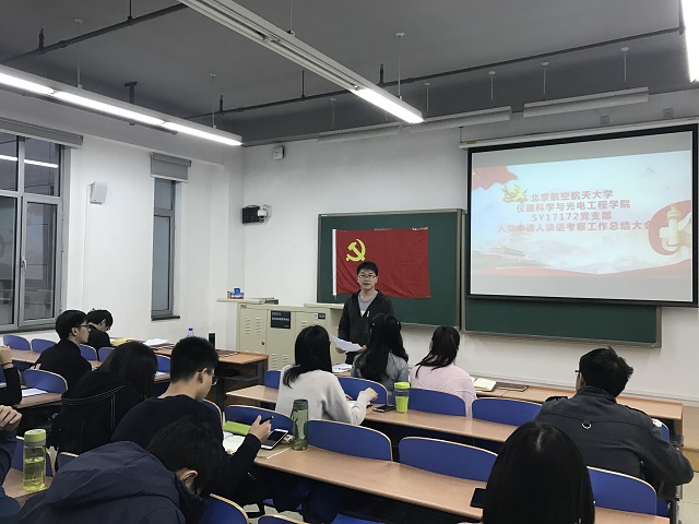 会前两周,根据考察方案中的精神,SY17172党支部21名党员分为10组,分别与14名向党组织递交了入党申请书的同学进行了谈话。谈话内容包括入党动机、对党的认识、十九大报告学习情况以及两会热点等等。